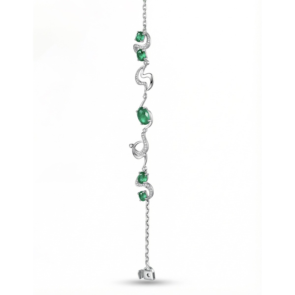 Part of The Unwritten collection, the Emerald Flow Bracelet reflects the beauty of movement and the quiet poetry of evolving stories. The design features a sequence of vivid emerald gemstones set along a delicate silver chain, each stone glowing with deep green brilliance that symbolizes vitality, renewal, and timeless elegance.
